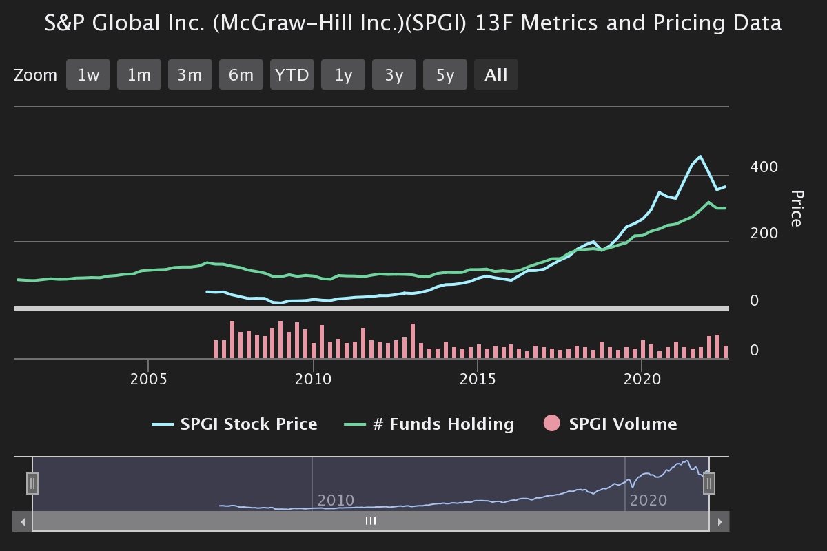 Analysts anticipate positive revenue momentum, with growth increases that could bring revenue to approximately $13.0 billion by December 2023, up from an estimated $12.0 billion in 2022. Year-over-year estimated increases could also bring earnings to $13.87 per share by December 2023, up from a predicted $11.48 for December 2022. The 13F metrics between 2007 and 2022 show that funds held remain on an upward trajectory despite fluctuations in S&P Global’s stock price.