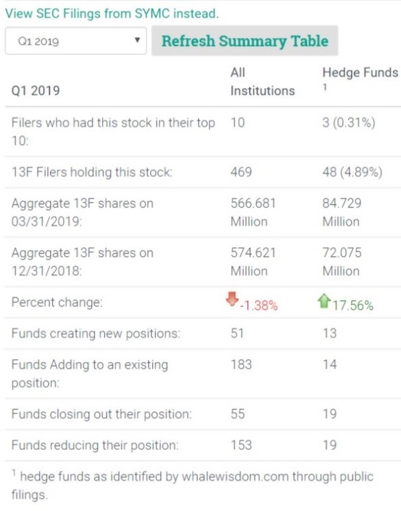 Symantec was a stock that was hot among institutional investors during the first quarter of 2019. The equity was added to the WhaleWisdom WhaleIndex 100 on May 15, and it has risen by more than 27% since the addition. The stock was particularly active among hedge funds during the first quarter.