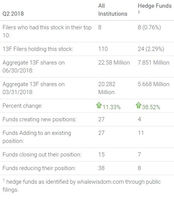 During the second quarter, the number of total 13F shares held by institutions increased by over 11% to 22.6 million. Hedge funds were buying the shares even more aggressively, with the number of total 13F shares held rising by over 38% to 7.8 million. In fact, of the 24 hedge funds that own the stock one-third of them own it within their top 10 holdings.