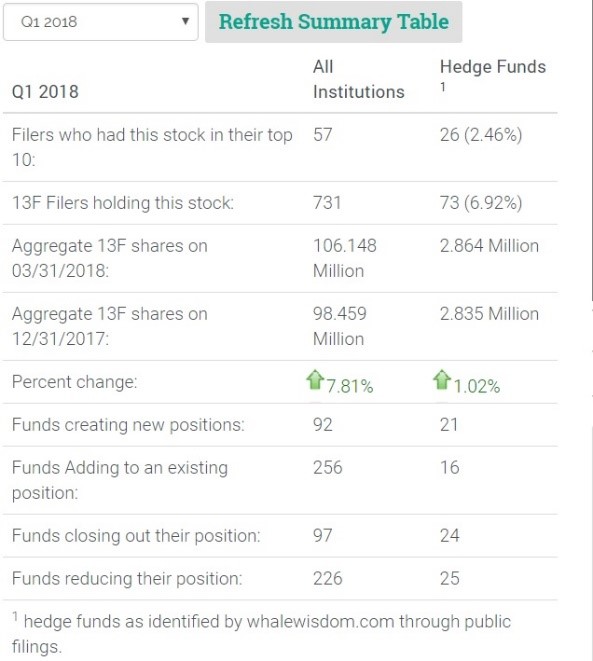 During the first-quarter institutional investors increased the number of aggregate 13F shares held by 7.8 percent to 106.15 million from 98.46 million in the fourth-quarter. 92 institutions started new positions, while 256 adding to existing shares. Meanwhile, 97 institutions exited the stock, while 226 reduced their holdings. It is surprising, given the fact shares fell nearly 14 percent during the quarter.