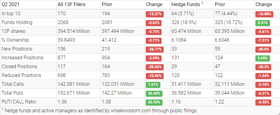 In the second quarter of 2021, Tesla’s shares lost traction as hedge funds and institutions decreased shares in their portfolios. The aggregate 13F shares held by hedge funds decreased to about 60.5 million from 63.4 million, a change of approximately 4.6%. Reviewing hedge funds, 33 created new positions, 131 added to an existing holding, 29 exited, and 120 reduced their stakes. Overall, institutions were selling and lowered their aggregate holdings by about 0.8% to approximately 394.5 million from 397.5 million.