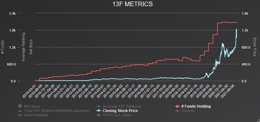 Analysts estimate that year-over-year increases will bring earnings to $8.36 per share by December 2022, up from December 2021’s predicted $6.14 in earnings. Revenue estimates are also encouraging at approximately $51.2 billion by December 2021 and rising to about $70.6 billion by December 2022. The long-term 13F metrics between 2010 and 2021 demonstrate that Tesla’s investment potential remains on an upward trend.