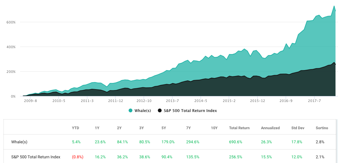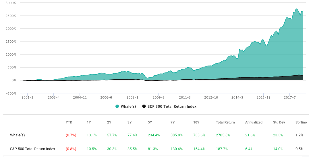 The WhaleWisdom activist small cap strategy showed a total return of 894.2% since 2009 — 3.49X the S&P 500 total return. Standard deviation was 21.5% vs 12%.
