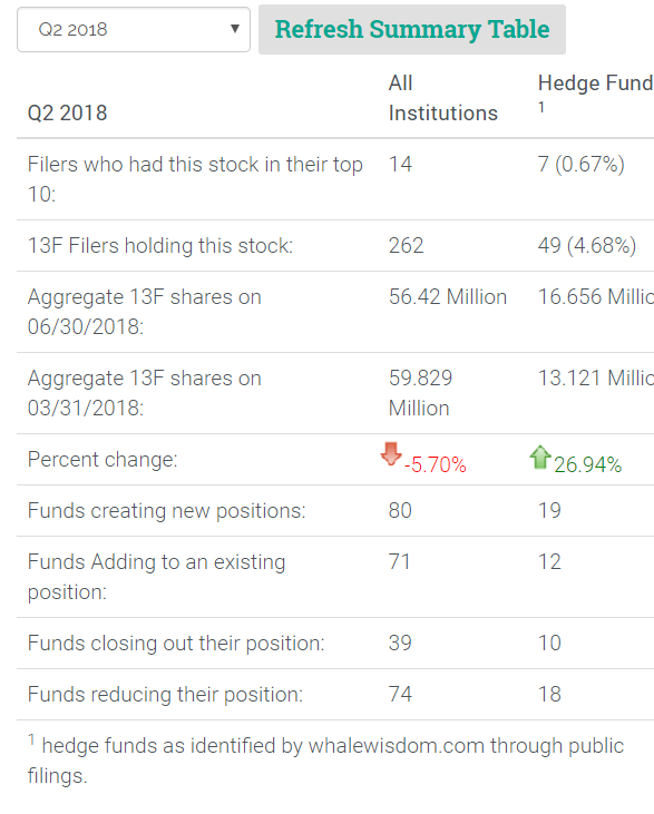 During the second quarter, hedge funds increased their total 13F holdings by 27% to 16.6 million shares. Also, 19 of the hedge funds started new positions in the stock while 12 added to existing ones. Meanwhile, 10 closed their holdings and 18 reduced their stakes. Overall the number of total institutions, including investors such as mutual funds, decreased their total 13F holdings by 6% to 56.4 million.