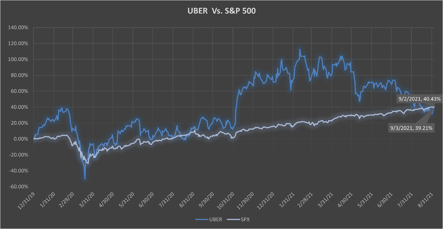 Uber Technologies, Inc. (UBER) has been on a rocky path over the past year and a half, and the gains realized over the past six months appear to have stalled. The ride-sharing company’s stock has recently fallen, bringing it into alignment with the S&P 500. Uber rose by approximately 40.4% as of late August 2021 compared to the S&P 500’s gain of roughly 39.2% since the start of 2020.
