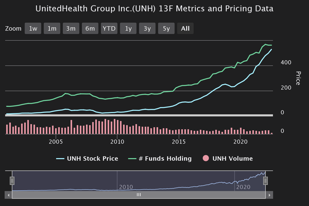 Hedge Funds adjusted their portfolios, and the aggregate 13F shares held decreased to approximately 143.0 million from 150.7 million, a reduction of about 5.1%. Overall, for hedge funds, 29 created new positions, 173 added, 46 exited, and 206 reduced their stakes. Institutions decreased their holdings by about 1.2% to 801.4 million from 810.9 million. The track record of 13F metrics between 2000 and 2022 suggests that UnitedHealth remains on an upward trend.