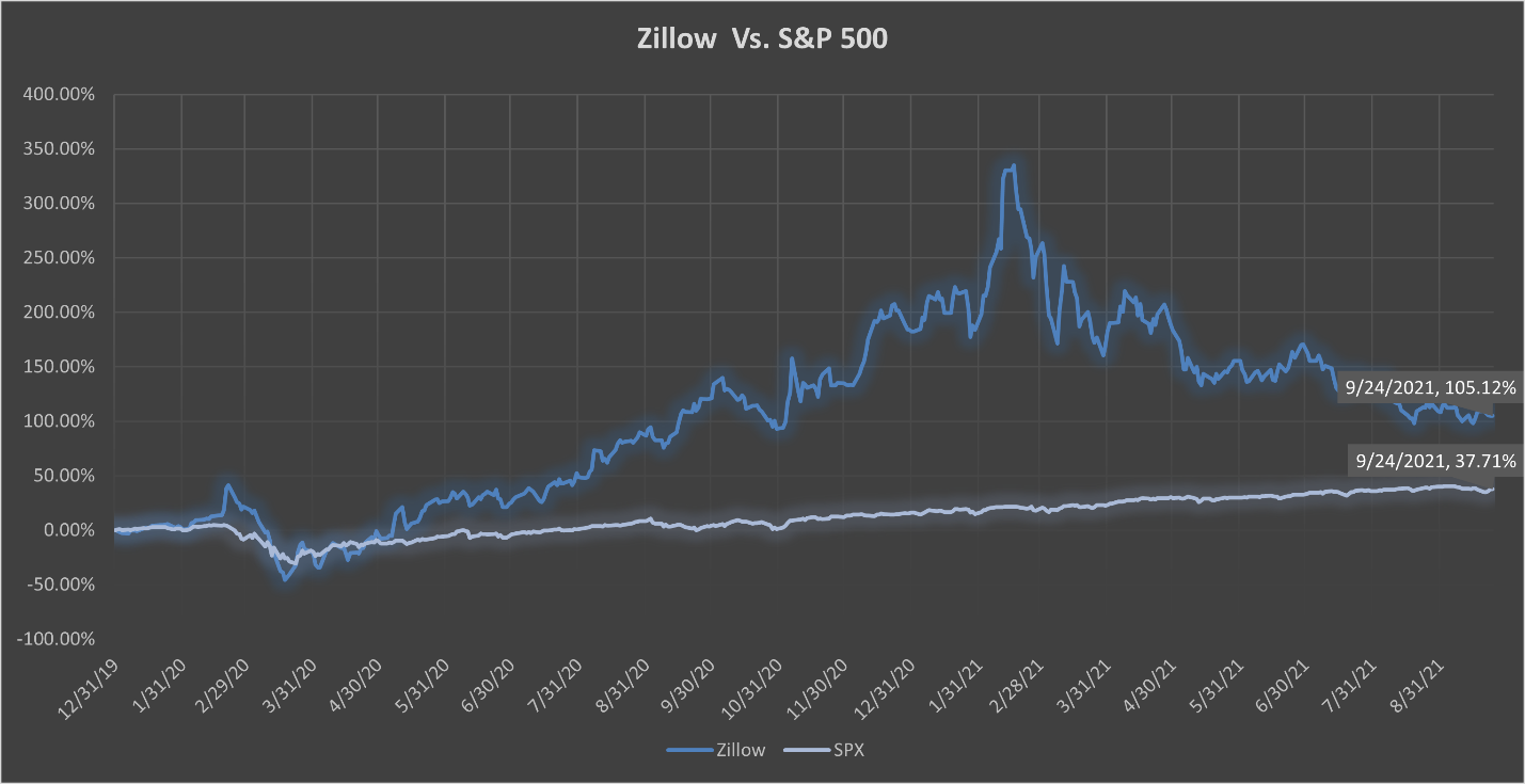 Though Zillow’s stock value has fallen since February 2021, it continues to outperform the S&P 500. The U.S. housing market has seen soaring prices and high demand for inventory over the past year, offering continuing opportunities for Zillow’s business model. Zillow’s real estate marketplace has the potential to continue to see growth in parallel to the housing market. Analysts’ earnings predictions and the stock’s currently lower value may be attractive for long-term investors.