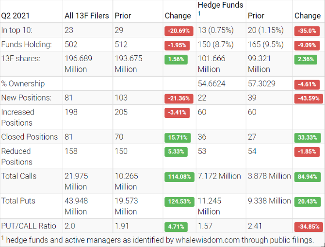 In the second quarter, aggregate 13F shares held by hedge funds increased to about 101.7 million from 99.3 million, an increase of approximately 2.4%. Hedge funds created 22 new positions, 60 added to an existing one, 36 exited, and 53 reduced their stakes. Institutions are also buying the stock, and aggregate holdings increased by about 1.6% to approximately 196.7 million from 193.7 million.