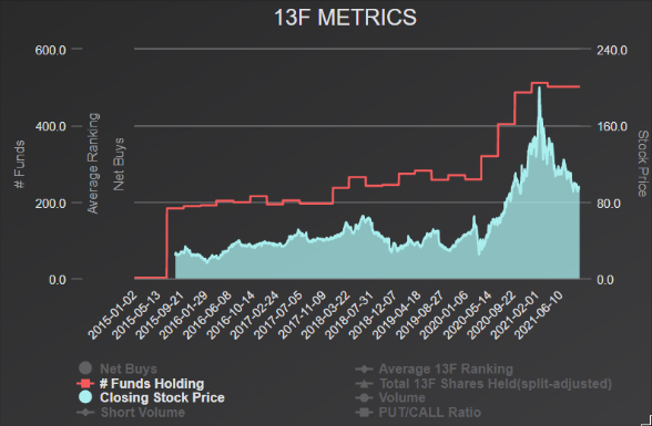 Analysts estimate that year-over-year increases will bring earnings to $1.29 per share by December 2022, up from December 2021’s predicted $1.05 in earnings. Revenue estimates are also encouraging, forecasting approximately $6.6 billion by December 2021 and rising to about $9.9 billion by December 2022. The 13F metrics between 2015 and 2021 reflect Zillow’s rising stock value with a peak in early 2021.